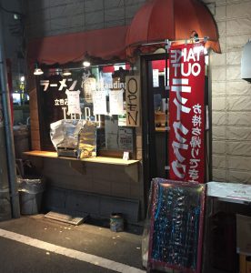 大井町東小路にある「立呑みTHIRD」へ入店。ラーメンと立ち飲みの混合形態のお店である。ラーメンは店内、立ち飲みは店外となっている。