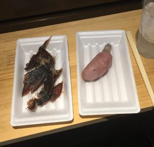 おつまみは「ホタルイカ干し」250円と「骨付きソーセージ」250円。